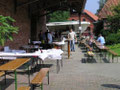 Auf dem Hof von Henning Schmidt sind die Helfer der Vereine und der Dorfgemeinschaft dabei Bänke und Tische aufzustellen, die "Fressmeile" entsteht, Beleuchtung für den Abend wird installiert.